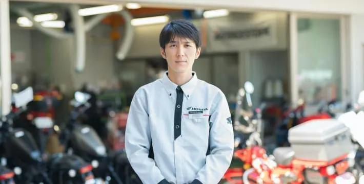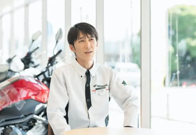 私がこの道に進んだのは、父親の世代がまさにバイクブーム。物心ついたときから家にはいつもバイクがあって、親父が乗っている姿に影響を受けたからです。一度は町の小さいバイク屋さんに整備士として就職しました。しかし、もっとスキルアップしたい、最新のバイクに触ってみたいという気持ちが強くなったタイミングに四日市店が新規オープンでスタッフを募集すると聞いて、応募しました。