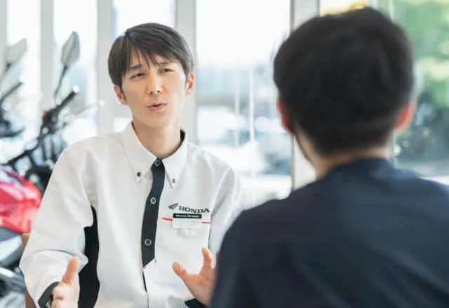 今は鈴鹿店の店長です。元々は整備職で工場長をしていました。今でも工場が忙しければツナギを着て整備をすることもありますし、ときには営業、販売も担当することもあります。販売するときは、お客さまの困りごとをお聞きして、整備士時代に培った知識を基にその方のライフスタイルに最適なバイクをご提案しています。